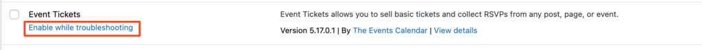 Note: To be able to activate a plugin in Troubleshooting mode, the plugin must already be active before you go into troubleshooting mode, otherwise, you don’t have the option to activate it.