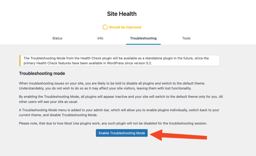 To enable this, go to Tools > Site Health > Troubleshooting, then click Enable Troubleshooting Mode: