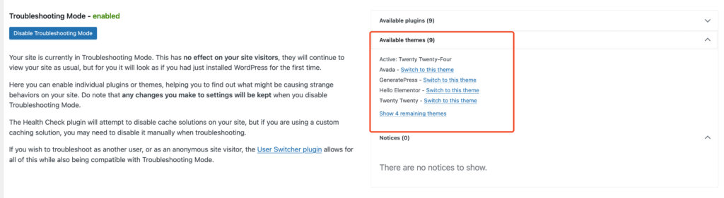 Troubleshooting Mode is the heart of the Health Check & Troubleshooting plugin. It’s the most helpful feature for safely testing and diagnosing issues on your site. With Troubleshooting Mode, you can deactivate themes and plugins just for your session, so you can figure out what’s causing conflicts—without affecting your live site or visitors.