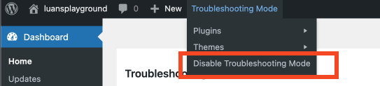 To disable troubleshooting mode, you can go to your Dashboard and click “Disable Troubleshooting Mode” (image above), or you can do that from your Admin bar: