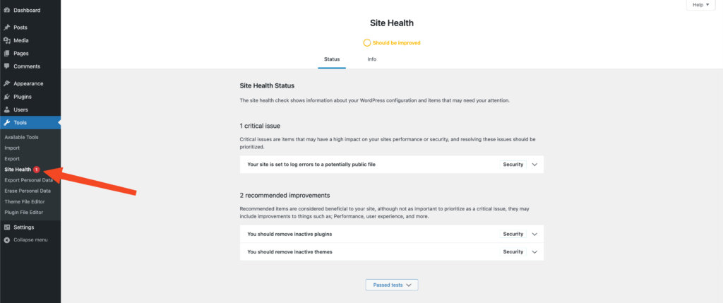 To access the plugin go to Tools > Site Health. The default overview page offers a similar view to the in-built health check tool in WordPress.