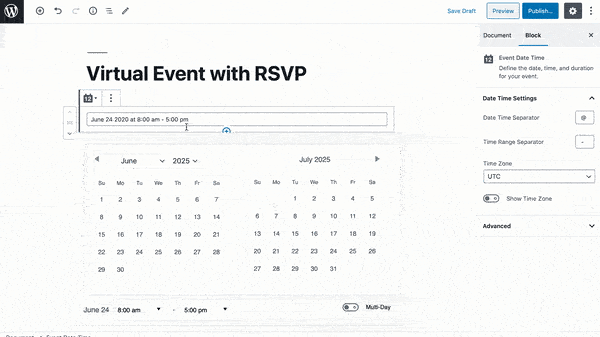 With the Event Tickets plugin, we can technically add an RSVP or ticket sales to any page on our site. But since we’re using Event Tickets in conjunction with The Events Calendar, we’re going to add tickets to the virtual or hybrid event we’re creating on the calendar.