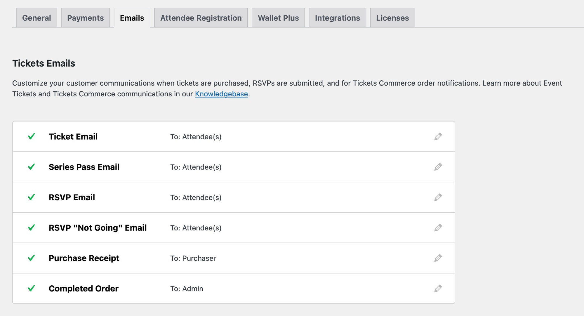 On the “Emails”, tab you will find a list of emails you can enable and configure separately. Each email listed in this section has its configuration page that can be accessed by clicking on the email title or the pen icon.