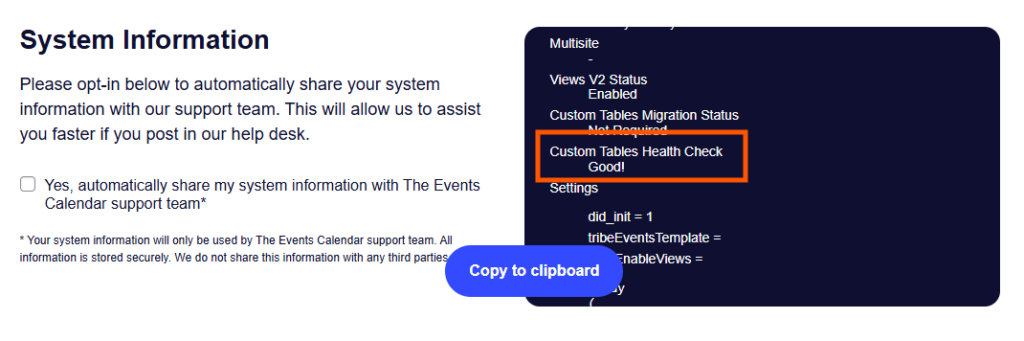 - Starting with The Events Calendar version 6.0, the plugin moved to using custom tables to efficiently store events data to the database, and sometimes a faulty migration or a database corruption after the migration could cause issues with the custom tables, which eventually leads to events going to 404. For this instance, it is best to check the custom tables health. — In your WordPress admin dashboard, navigate to Events -> Troubleshooting. Under the System Information section, ensure that the Custom Tables Health Check is in a Good! state (screenshot below). Otherwise, you may need to do the migration (see Migrating to the New Event Data System).