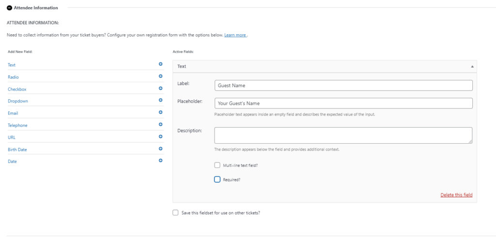 When using the RSVP functionality of Event Tickets, you’ll notice that only the main guest is asked or is required to submit their name and email address on the RSVP form. However, there may be a time when you need the names of the other guests that the main guests is bringing with. For this, we will tap on the Attendee Information feature of Event Tickets Plus and tweak it a bit to conform with our use case.