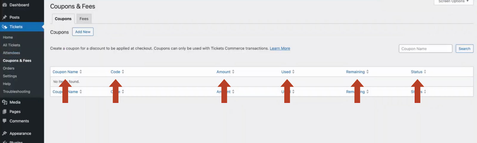 To create a coupon, from your WordPress dashboard select Tickets → Coupons & Fees → Coupon tab → Add New.