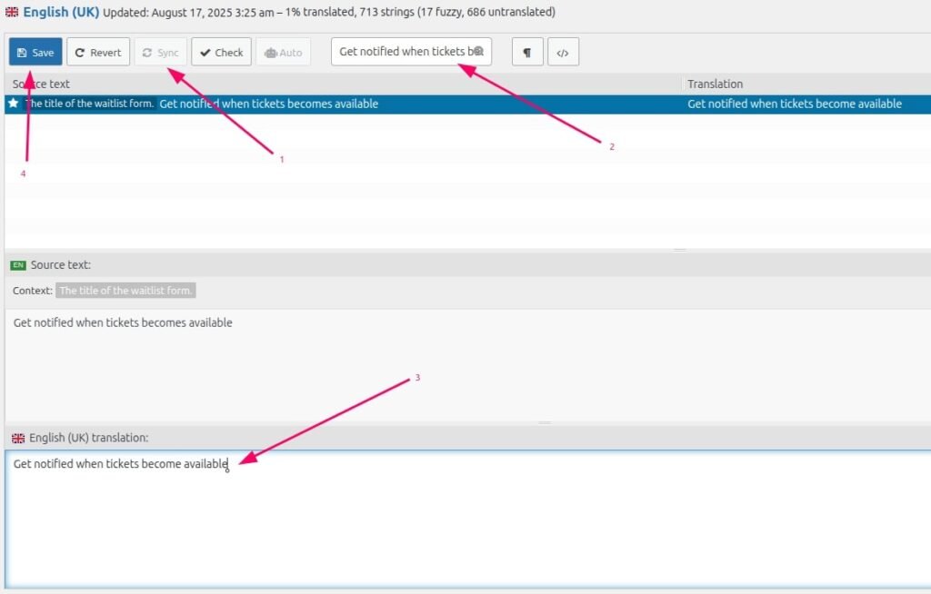 If you need to correct the grammar in the “Get notified when tickets becomes available” message to “become available,” you can update it in two ways: using Loco Translate or by adding a custom PHP snippet.