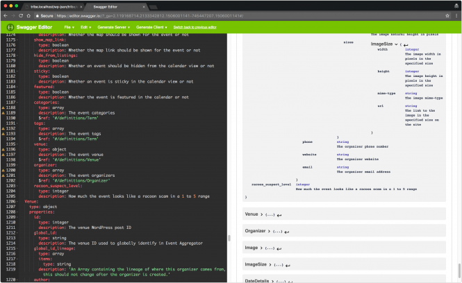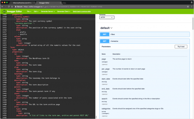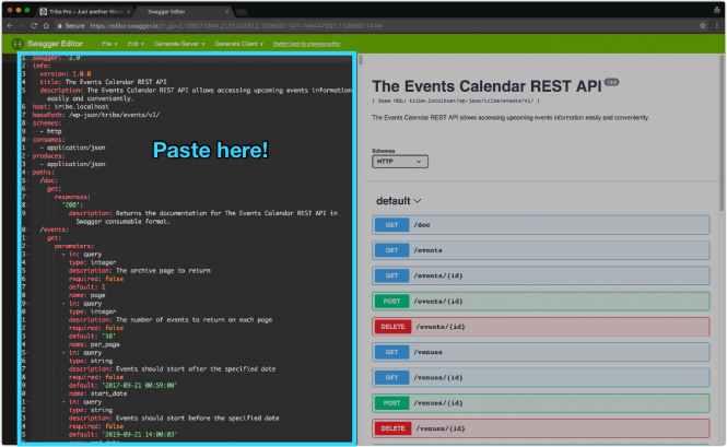 Let’s see how we can do that. First of all, head to the site /wp-json/tribe/events/v1/doc path on your site, and as before, copy the whole JSON format output. Head over to the Swagger.io Editor page: