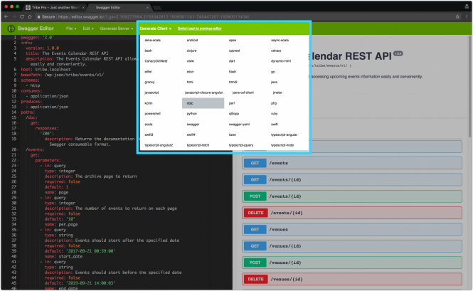 Remember before, when, while talking about the Swagger.io format documentation, we mentioned being able to create clients for The Events Calendar REST API in one click?