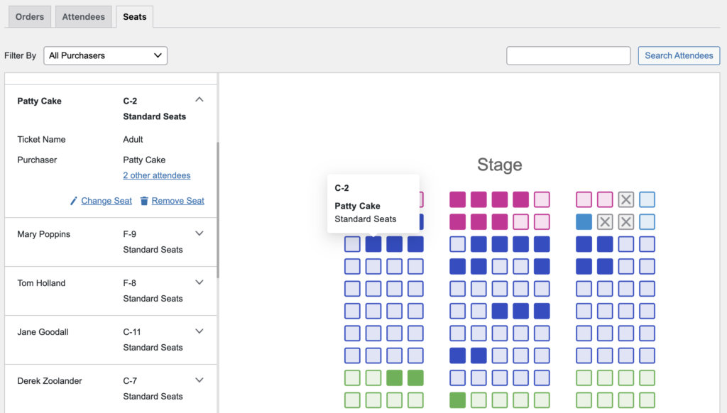 If the order status changes, there will not be any automatic change to the attendee’s seat assignment. If something goes wrong with the payment or someone wants a refund and will not be attending, you’ll need to take manual action in order to free up their seat(s) to be purchased by someone else. You can either delete the attendee completely (from the Attendees tab) or remove the attendee’s seat assignment (from the Seats tab) in order to change the seat from reserved to available. Then someone else will be able to purchase and reserve that seat.