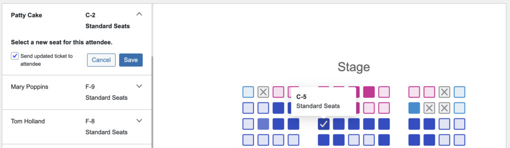 From the Seats tab, you can change any attendee’s seat assignment. Select an attendee from the list or click an occupied seat on the layout. From the attendee list, select the Change Seat option and select a new seat from the available seats on the layout. By default, the attendee will get a new email with an updated ticket showing the new seat assignment. Or you can uncheck that option and they will not receive an email.