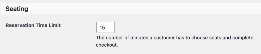 Under Tickets > Settings > General > Seating you’ll find a setting for defining the reservation time limit. By default, your customers have 15 minutes from opening the seat reservation modal to completing check out. You can use this setting to change that time limit as needed.