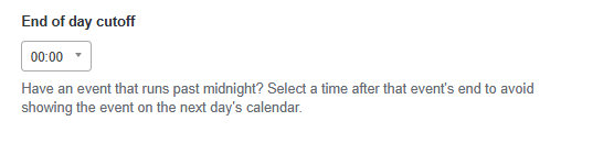 Fortunately, there is a simple way to fix this issue! Go to Events > Settings > Display > Date & Time and you’ll see an option to control the “End of day cutoff.” By moving this setting past midnight to the time when your nightly events end, you can prevent this awkward behavior of the event spanning multiple days on your calendar.