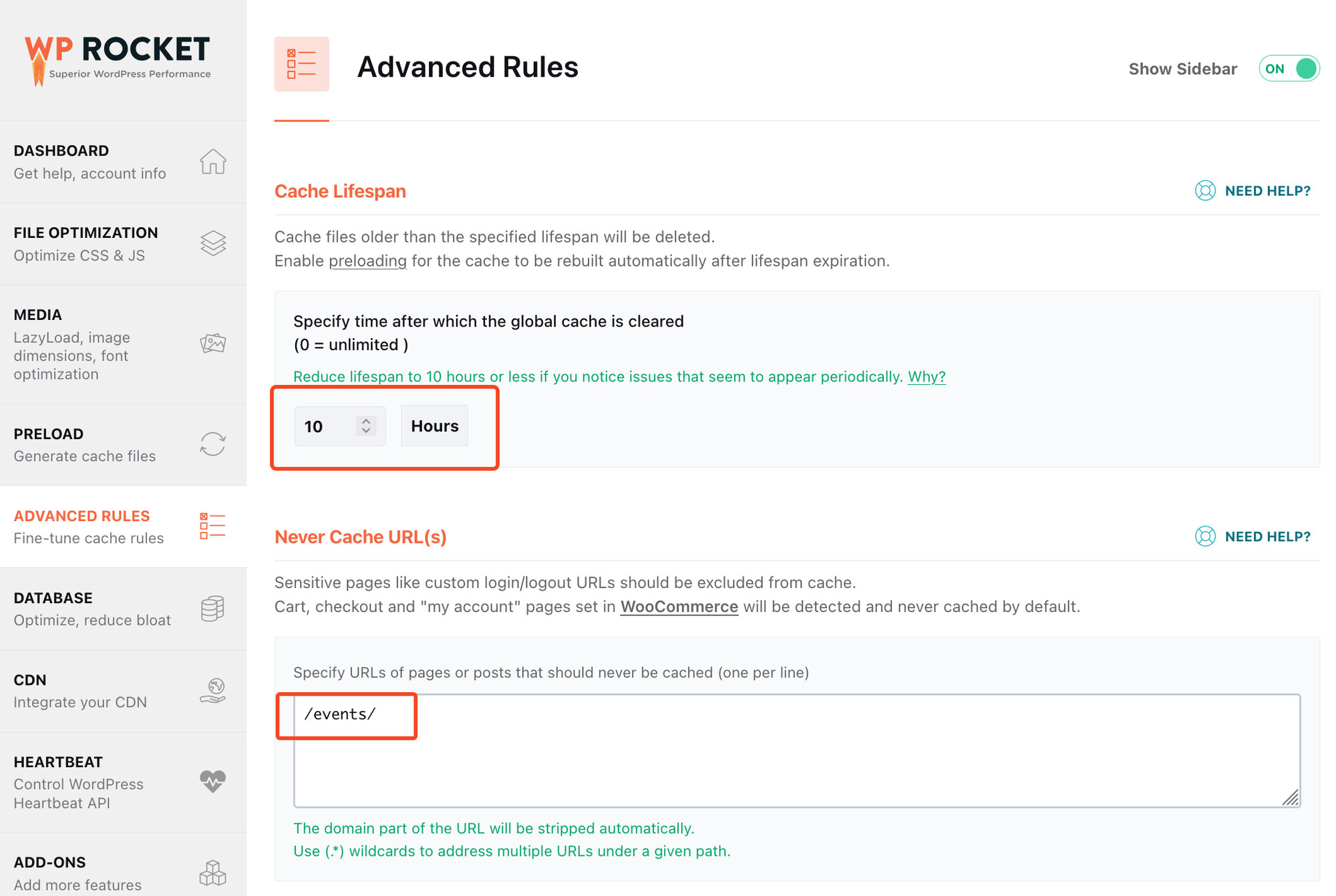 Also, at WP Rocket > Advanced Rules, set the Cache Lifespan to be lower than 12 hours to ensure that WordPress NONCE security Keys will work properly. If that number is more than 12 hours, the calendar pagination may not work properly, as it’ll request invalid security keys at some point.
